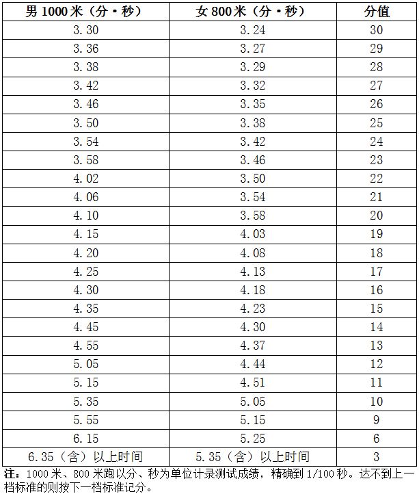 1. 评分标准:800米/1000米跑步采用电子计时,以秒为单位,按照成绩分段进行评分。