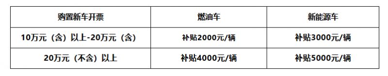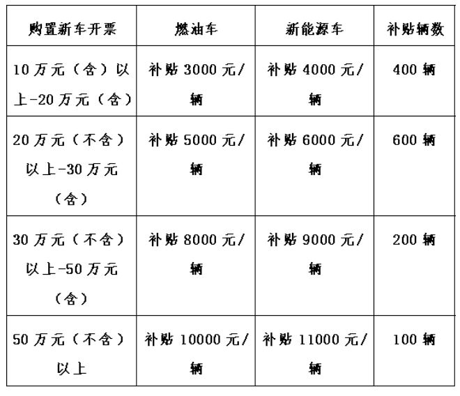 第一档,购车发票(含税,下同)金额为10万元(含)以上-20万元(含)以内,补贴400辆(购车直补300辆、报废换新100辆),原补贴标准为新能源乘用车新车补贴3000元/辆提高为4000元/辆;燃油乘用车新车补贴2000元/辆提高为3000元/辆。