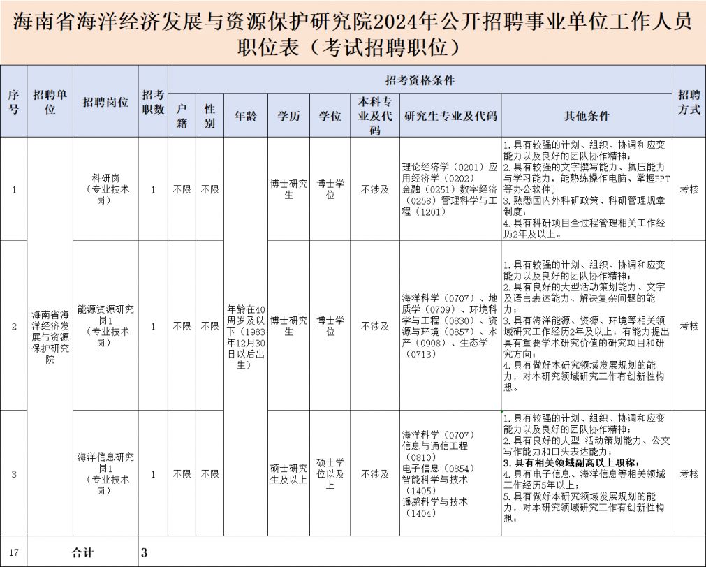 本次公开招聘工作人员共17名,其中,专业技术人员11名,管理人员6名。具体详见《海南省海洋经济发展与资源保护研究院2024年公开招聘事业单位工作人员职位表》(附件1-1、附件1-2)。岗位要求专业条件为报考者获得的最高学历对应专业。