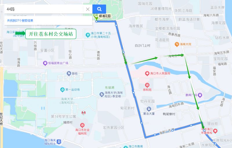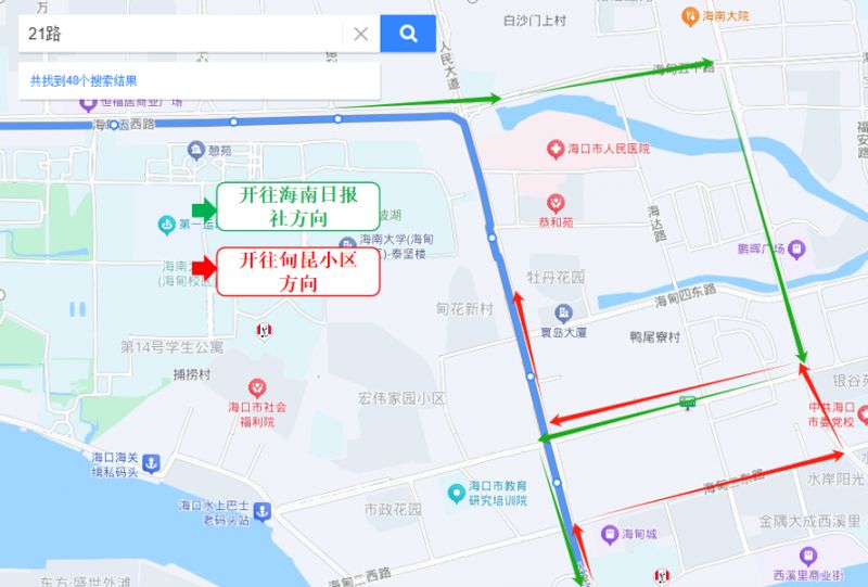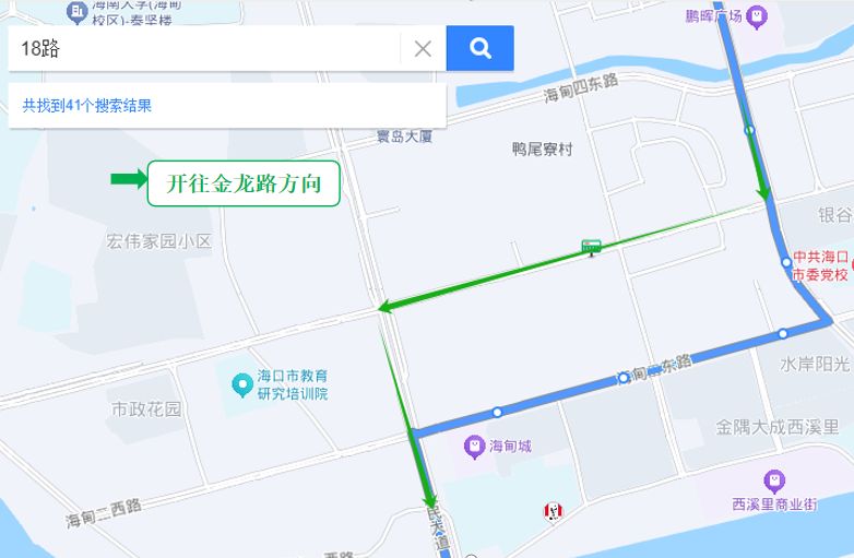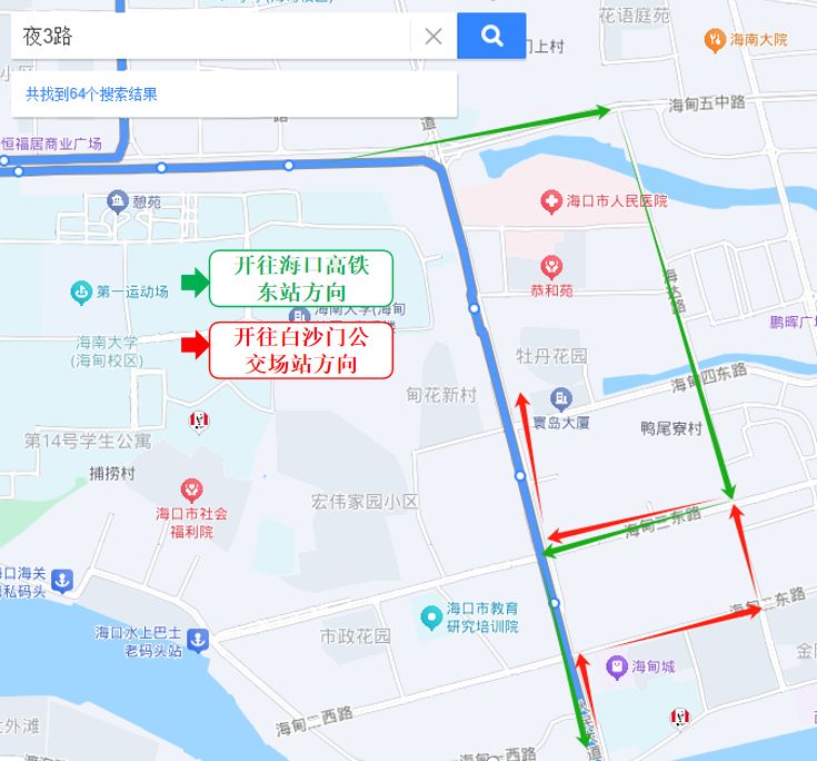 (二)调整站点:开往金盘方向取消“海南大学、京海花园、三东路口、中北大厦、海达一横路口、水岸阳光”等公交站点停靠;增加“白沙门小学、海甸五中路、福海新城、碧海云天、环岛大酒店、银谷苑”等公交站点停靠。