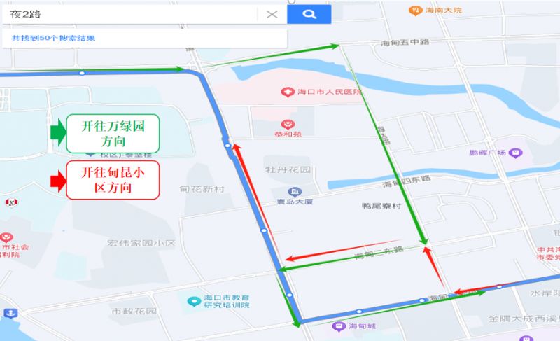(一)调整路段:开往万绿园方向车辆直行海甸五中路、右转海达路、右转海甸三东路、左转人民大道衔接原线路运营;开往甸昆小区方向车辆直行海甸二东路、右转海达路、左转海甸三东路、左转人民大道衔接原线路运营。
