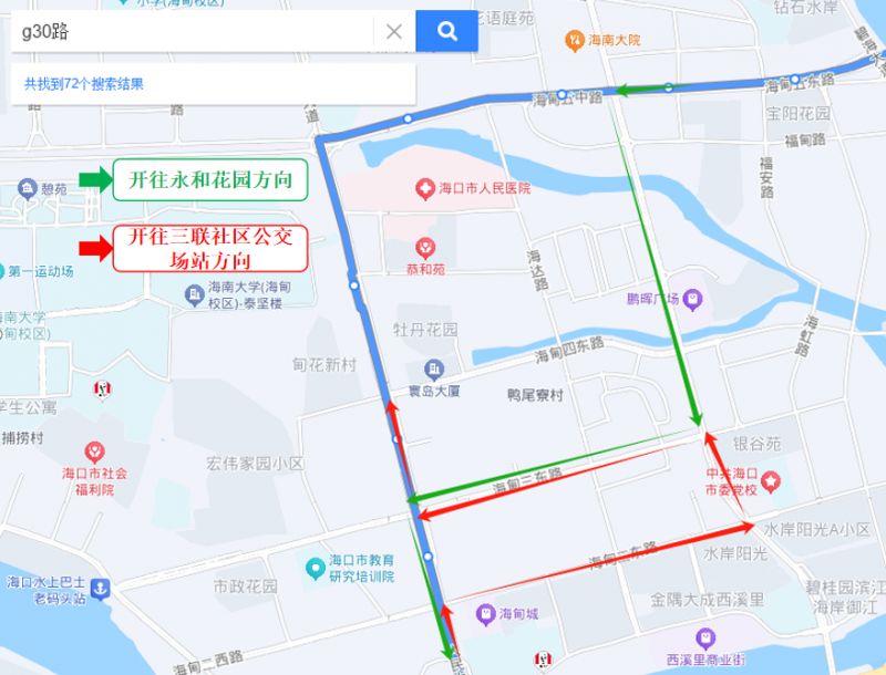 (一)调整路段:开往永和花园方向车辆直行海甸五东路、左转和平大道、右转三东路、左转人民大道直行衔接原线路;开往三联社区公交场站方向车辆右转海甸二东路、左转和平大道、左转海甸三东路、右转人民大道衔接原线路运营。