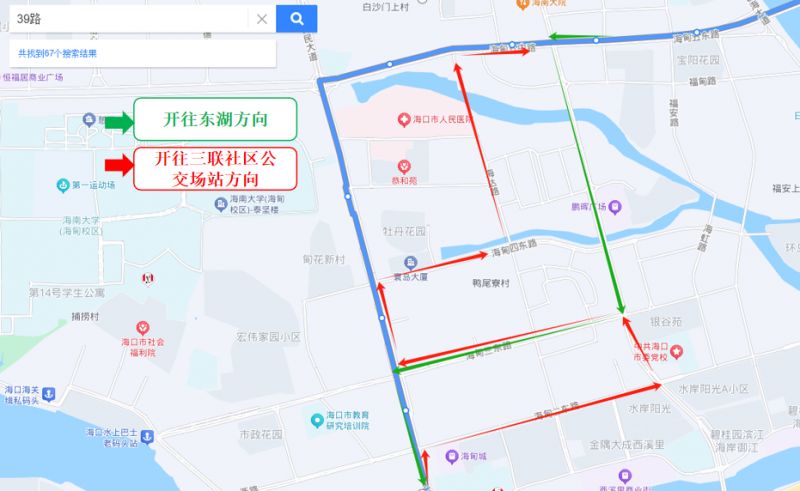 (一)调整路段:开往美苑小学方向车辆直行海甸五中路、右转海达路、右转海甸三东路、左转人民大道直行衔接原线路运营;开往白沙门公交场站方向车辆右转海甸二东路、左转海达路、左转海甸三东路、右转人民大道衔接原线路运营。