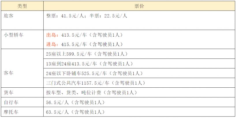 4. "票价": - 经济舱:约150元/人 - 豪华舱:约250元/人 - 车辆票价根据车型和大小有所不同,建议提前咨询。