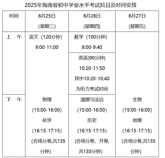 1.考试科目:语文、数学、英语(含听力)、道德与法治、历史、物理、化学、生物、地理、体育与健康共10科。除体育与健康外,各考试科目均实行全省统一命题、统一考试、统一评卷。体育与健康按《2025年海南省初中学业水平体育科目考试实施办法》(琼考中招〔2025〕1号)实行。