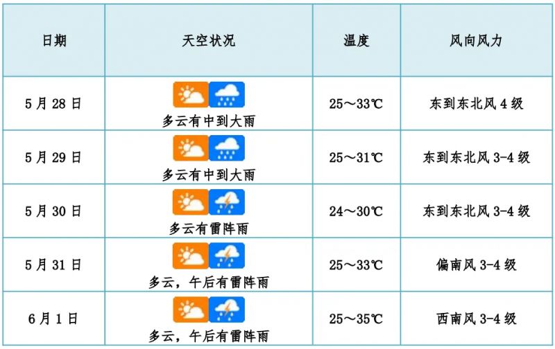 根据最新天气预报,预计,31日和 6月1日,多云午后雷阵雨;2830 日,受切变线影响,多云有中到大雨。户外活动需关注天气预警信息,雷雨期间请各位观众注意做好户外防雷避雨。