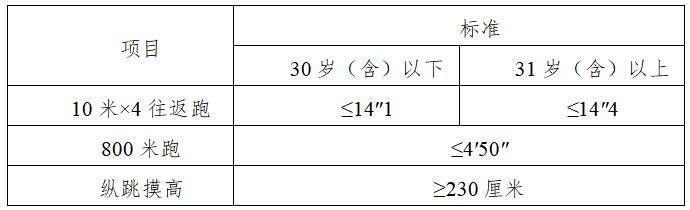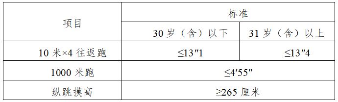 体能测评项目和标准如下,年龄计算时间截止参加体能测评当月: